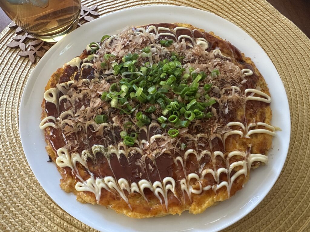 生地に粉なものを一切使ってないところ。それで、出来上がりはふわとろお好み焼きなの。