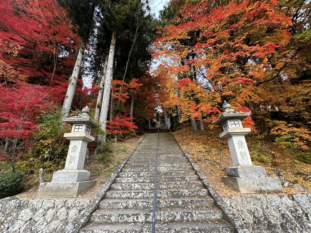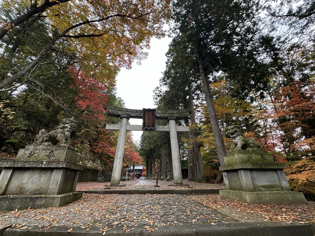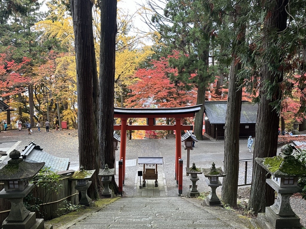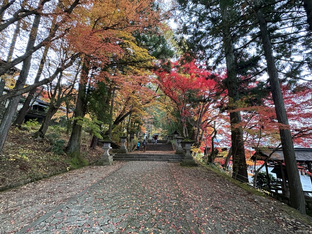 色鮮やかな紅葉に彩られた参道の入り口です。美しいですね✨