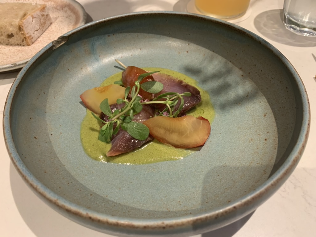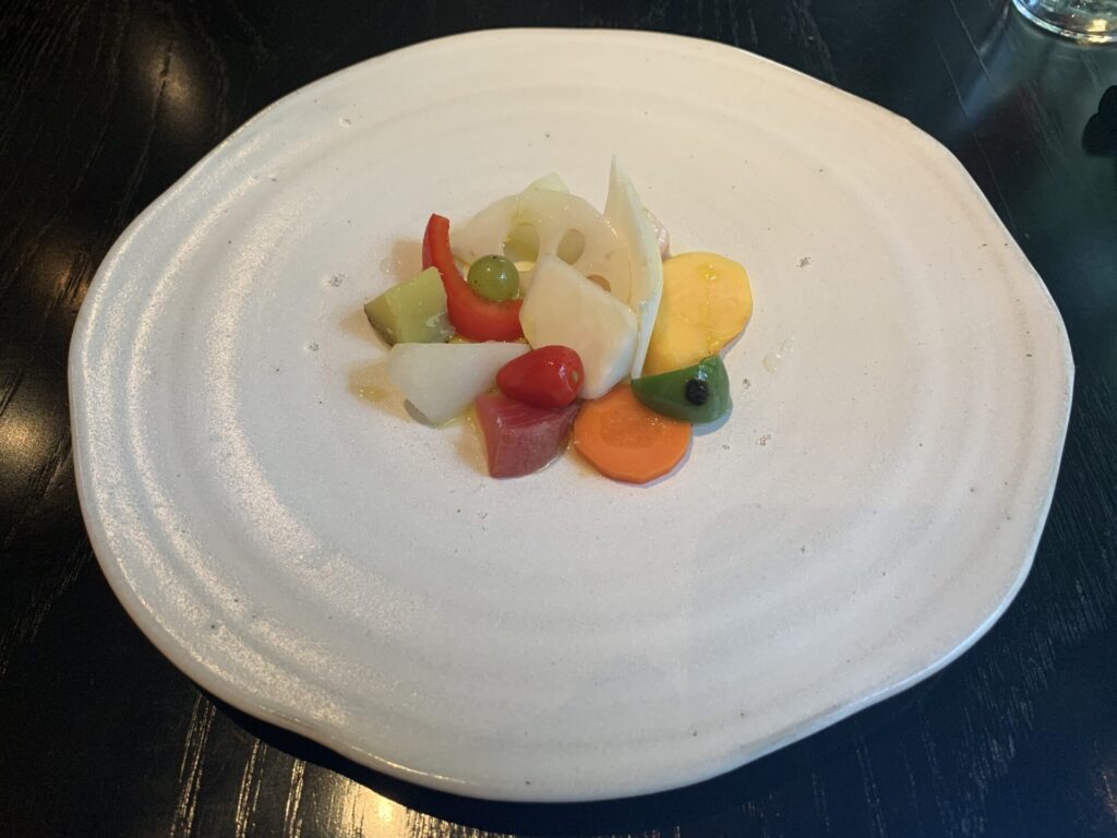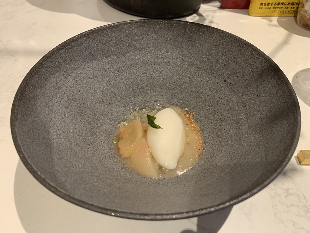 写真を撮り忘れましたが、お魚もあります!カマスで表面はこんがり、火入れが半分ぐらいでお刺身のように柔らかく、茄子のピューレ、茗荷、枝豆と食べると全てが調和して更に美味しかったです。