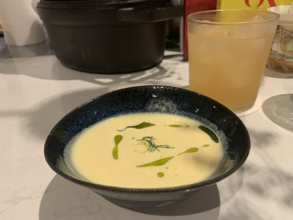 とうもろこしのスープから始まったのですが、とっても甘くてディルやオイルのアクセントがいい✨
