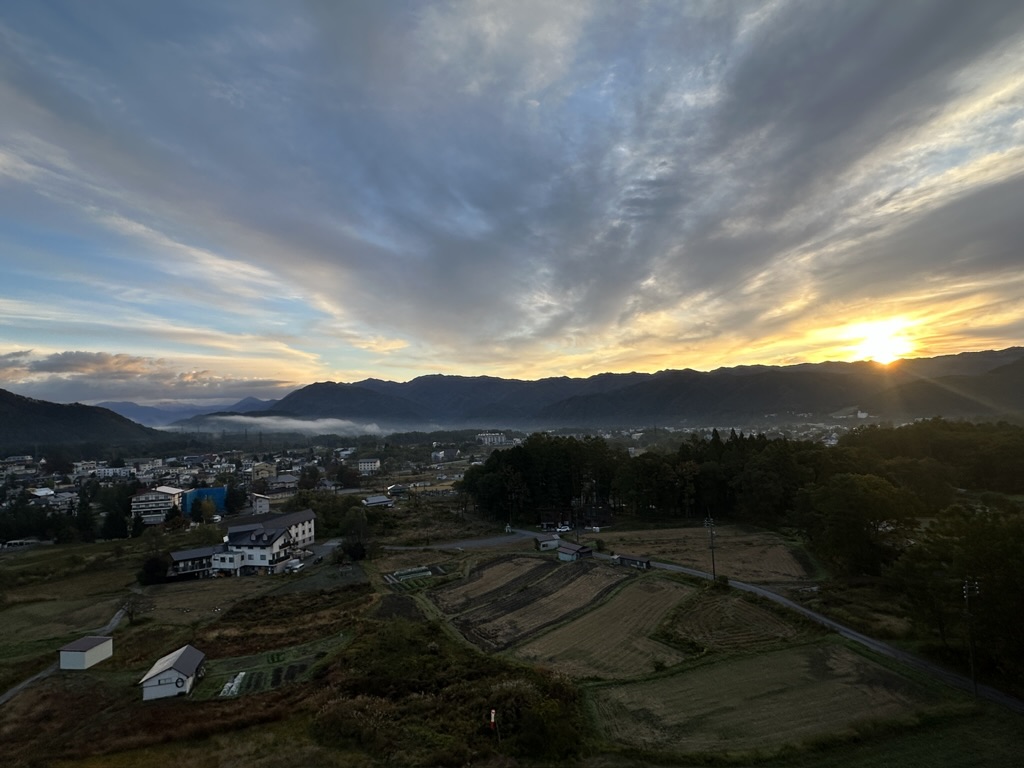 ・早朝の澄んだ空気の中、北アルプスの雄大な景色を大パノラマで堪能できます。