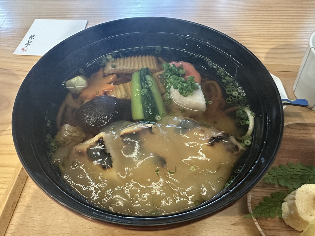 郷土料理「治部煮」をのせた、名物そばで、香ばしく焼いた鶏肉と加賀れんこんが練りこまれた特製そばがとても美味しい。
