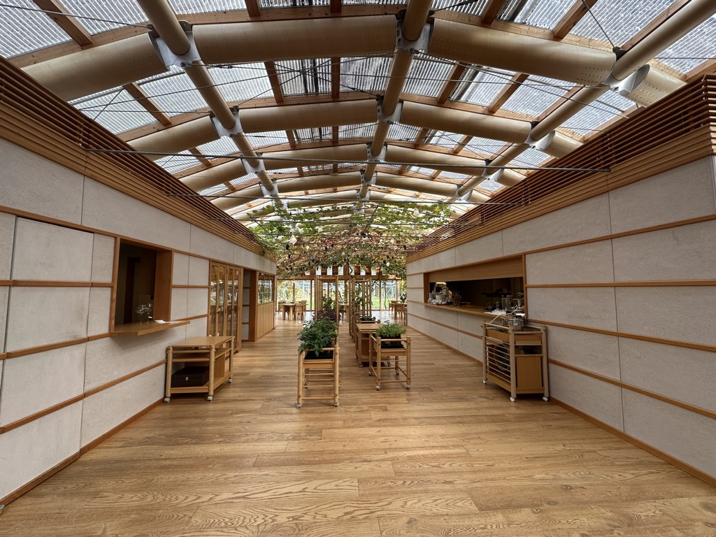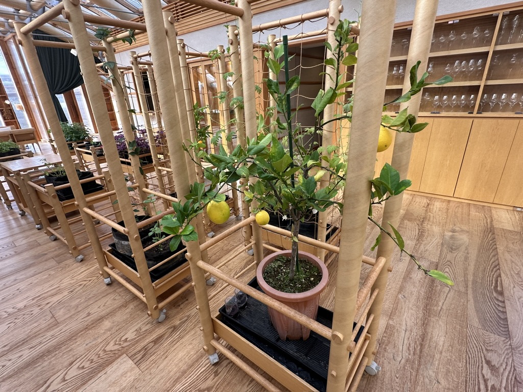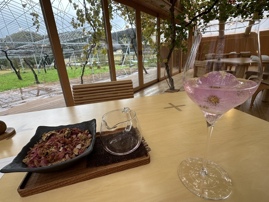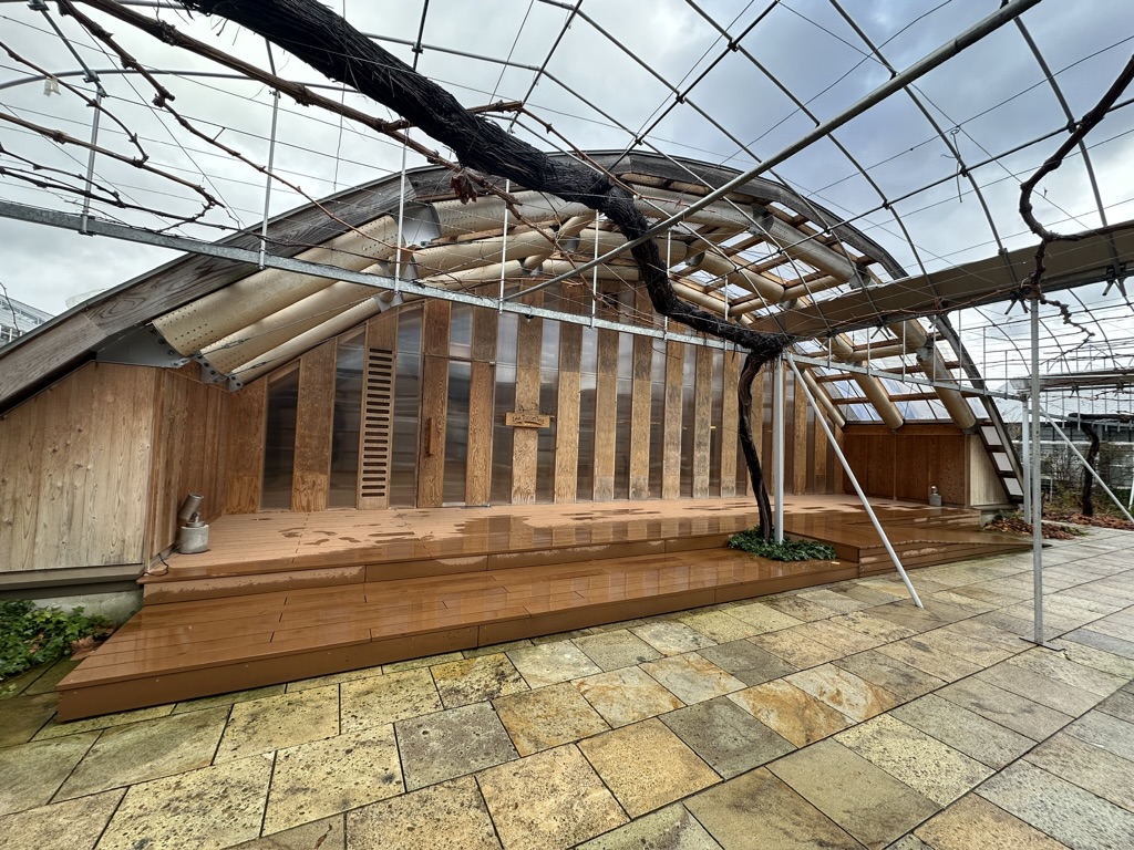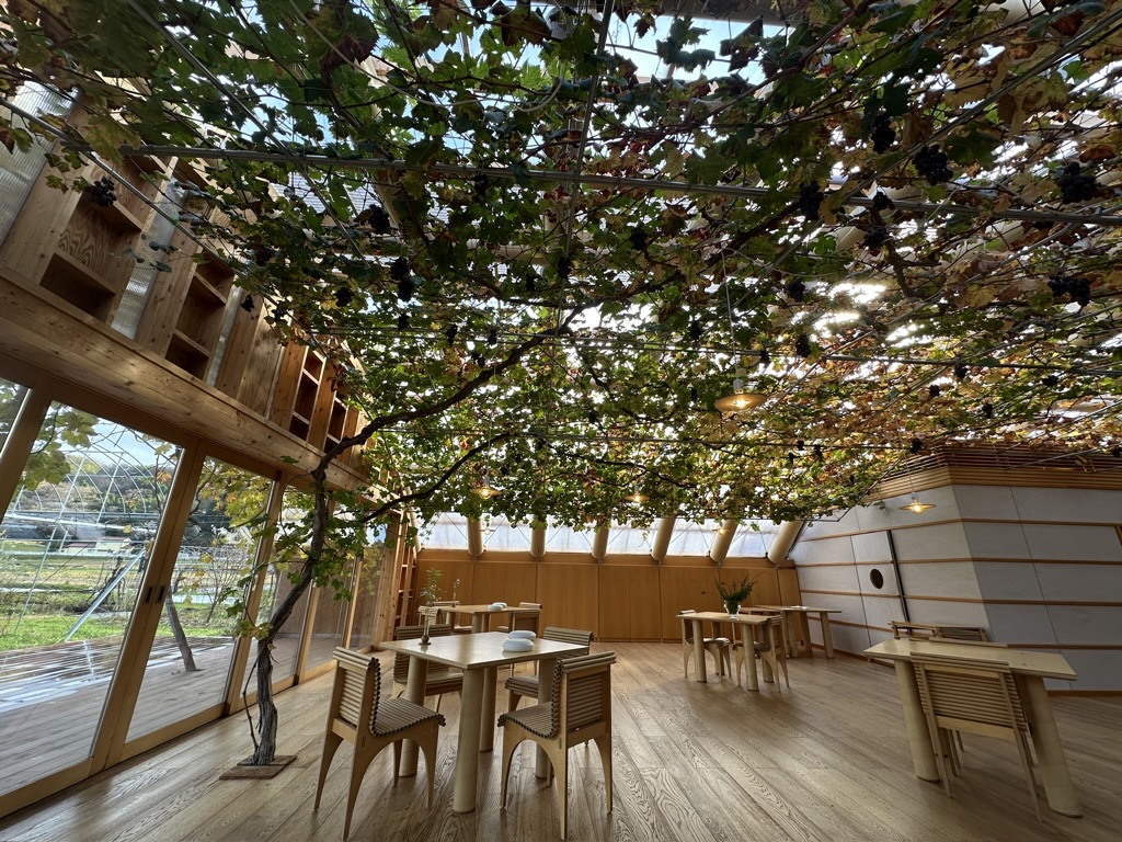 ぶどうの枝を引き込んでいて、天井を覆うダイニングは、窓外に広がるぶどう棚と一体感を出していて、別世界な空間でした。