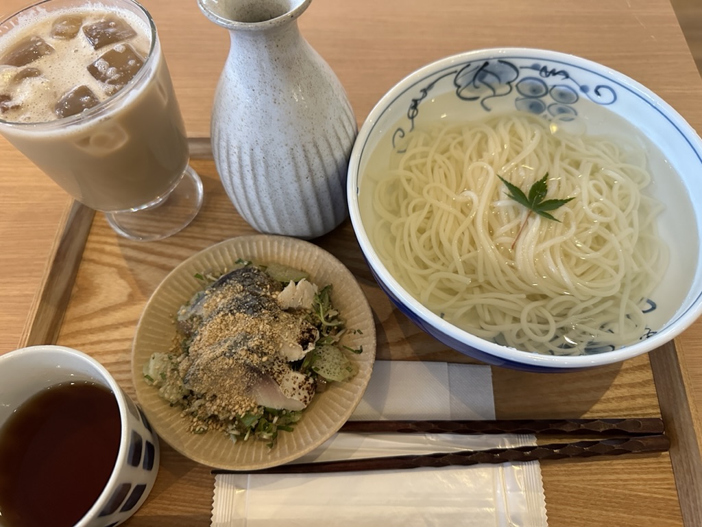 半田そうめんは、徳島県のご当地グルメですが、高知流に、高知県産の香味(生姜・大葉・ミョウガ・はす芋・かいわれ大根)と炙りしめ鯖で食べる、とってもスペシャルな一品✨