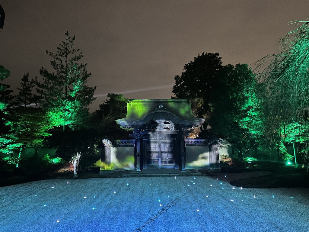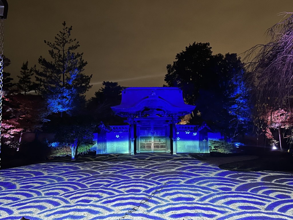 方丈前庭は、春は桜、秋は紅葉と美しい庭園で、夜の特別拝観ではプロジェクションマッピングがあります!