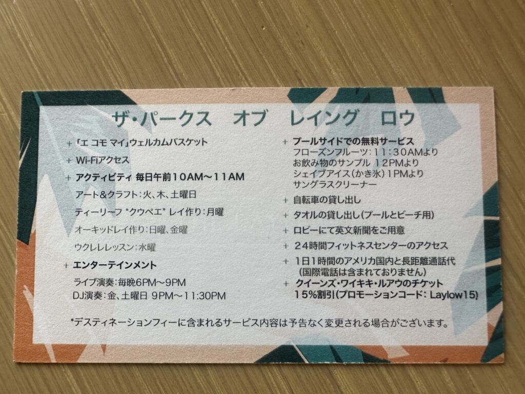 Juliこのホテルもリゾートフィーがあるんだけど、可愛い特典がいっぱいなんだ♪