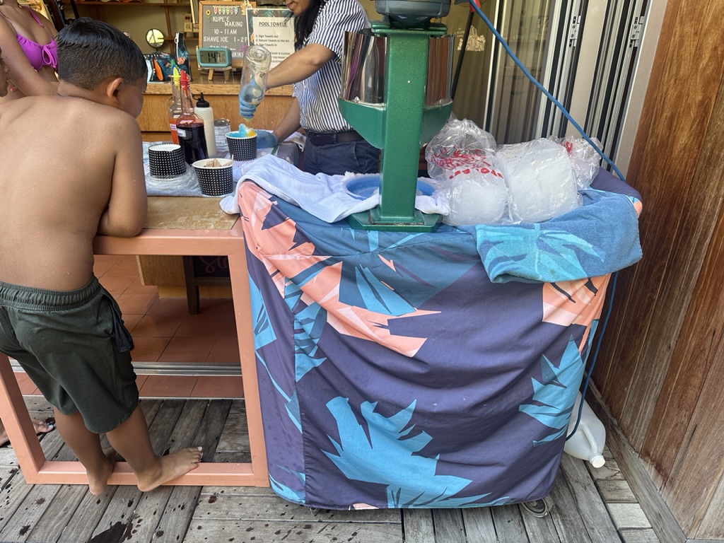 ショップの前にシェイブアイスのコーナーができていて、ちびっ子達が並んでました。