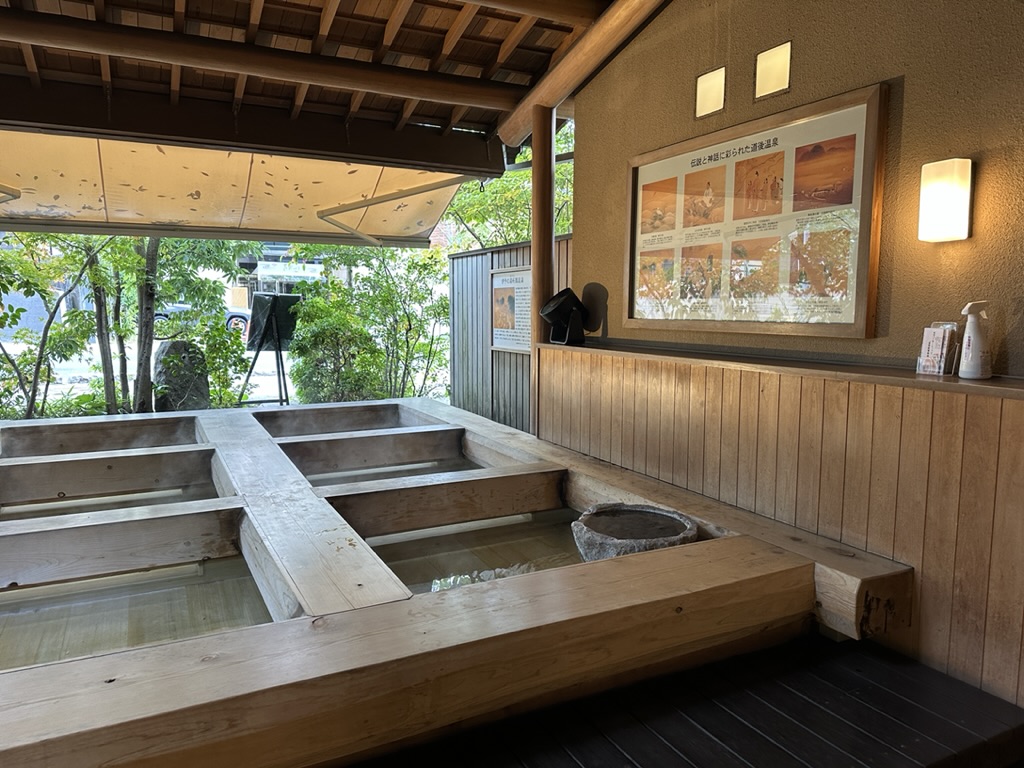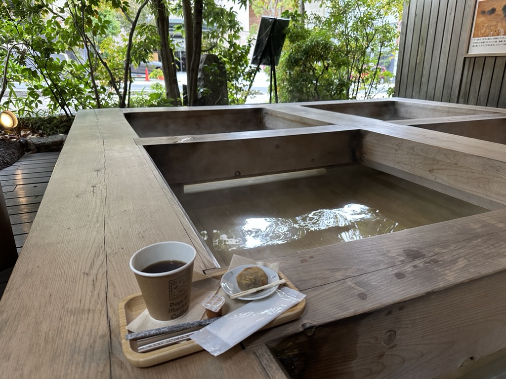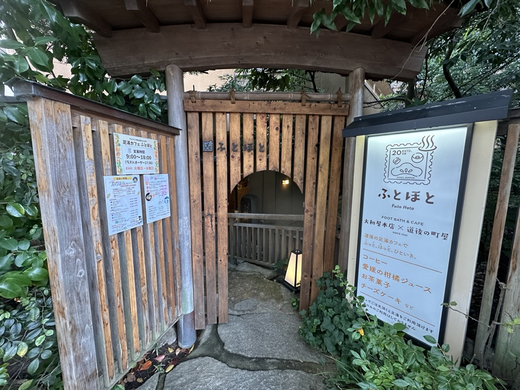 Juli道後温泉には、足湯ができるスポットはあるけど、「足湯かふぇ ふとほと」は、大和屋本店内にあって木々に囲まれながら癒しのひと時を過ごせるんだ!