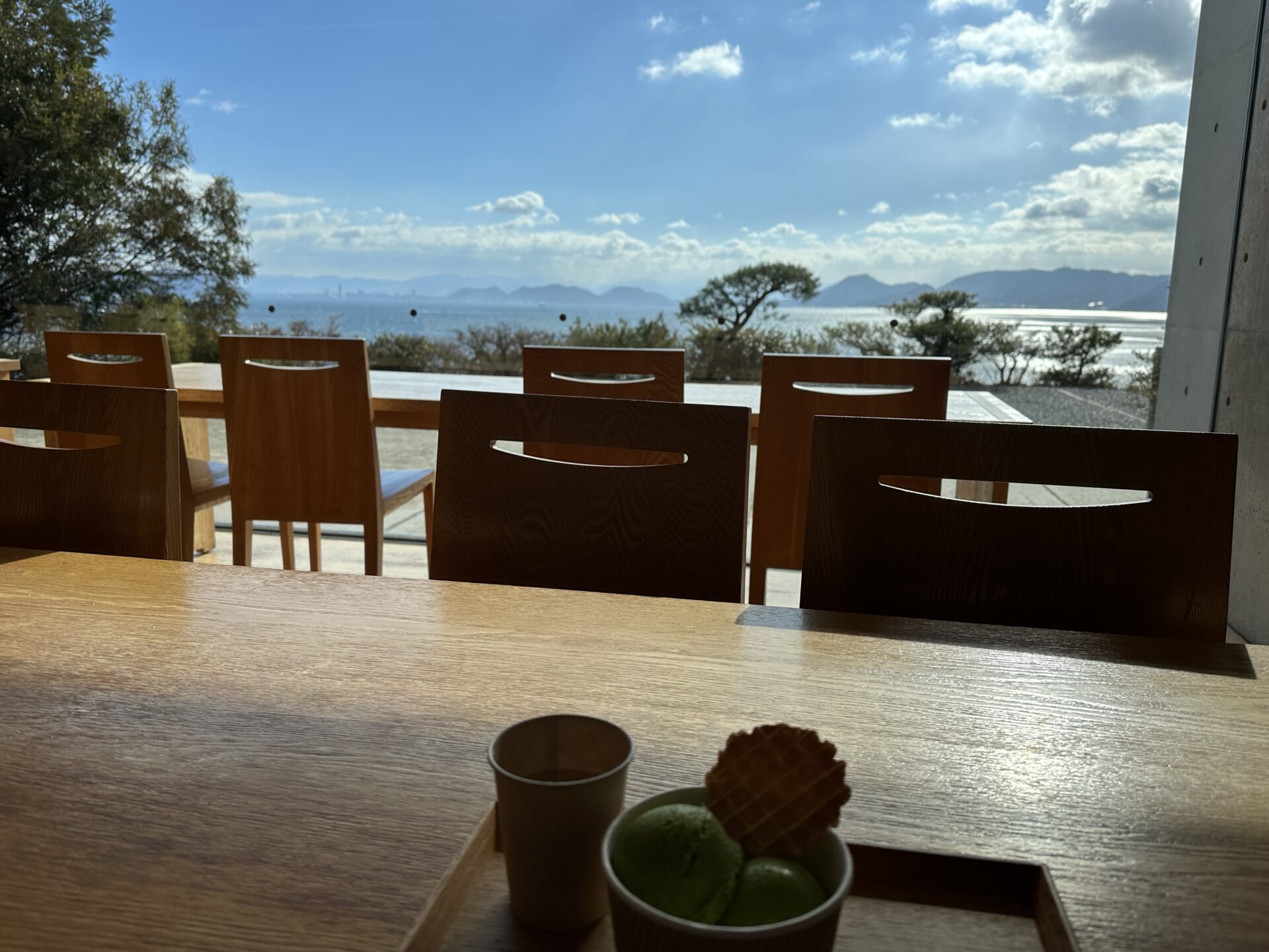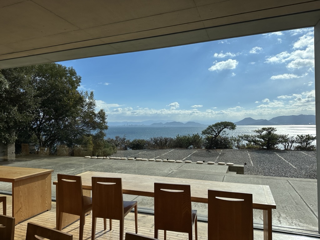 地中カフェ」は、地中美術館の中にあるカフェで、大きな窓一面に広がる美しい瀬戸内海の景色がまるで絵画のようなんだよね〜!