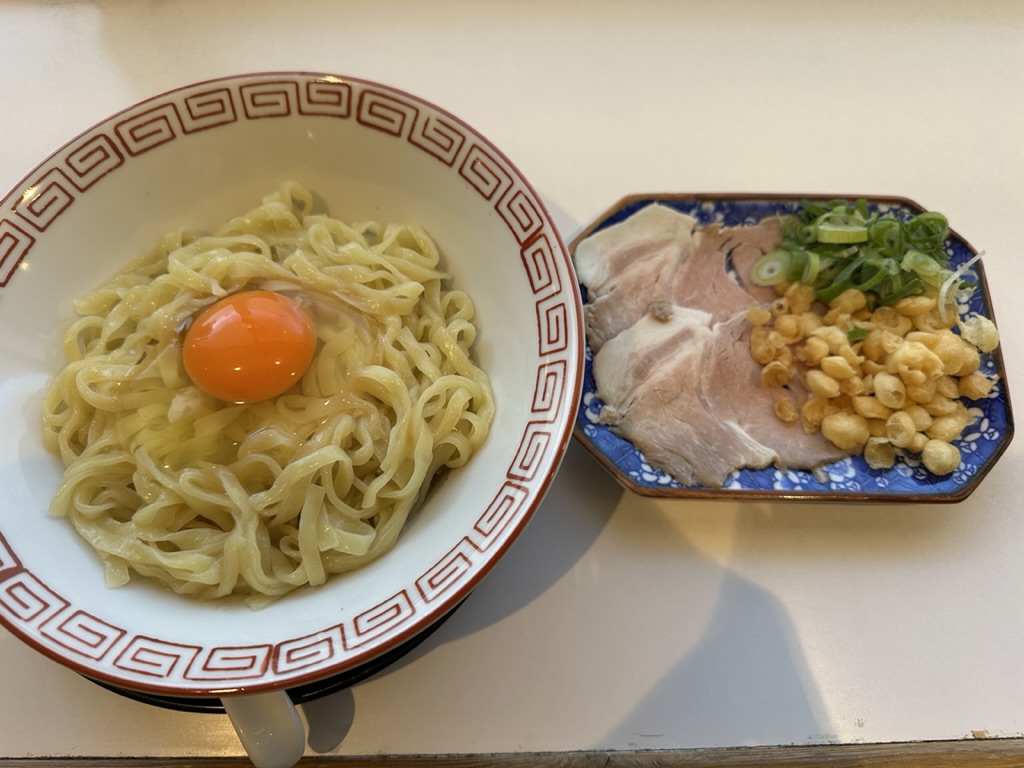 「魚群醤油麺まぜそば」は、モッチモチの太麺に卵が絡んで、美味しい✨