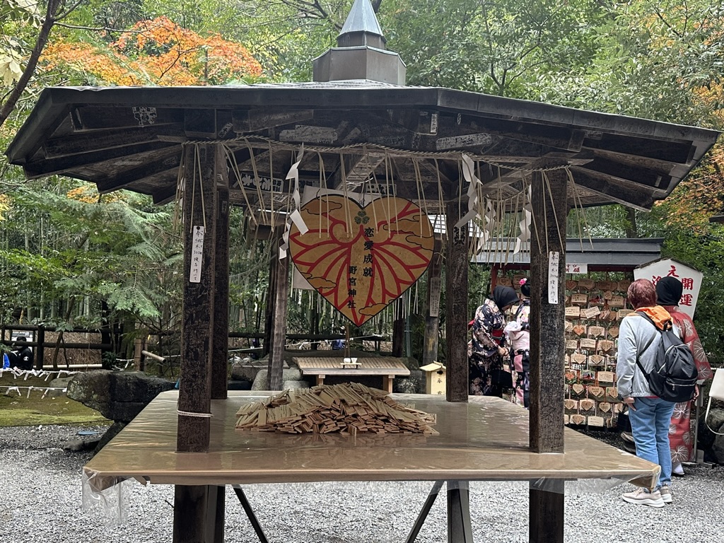 野宮神社は縁結びの神社としても有名で、恋愛成就のお札がたくさん重ねられていました。