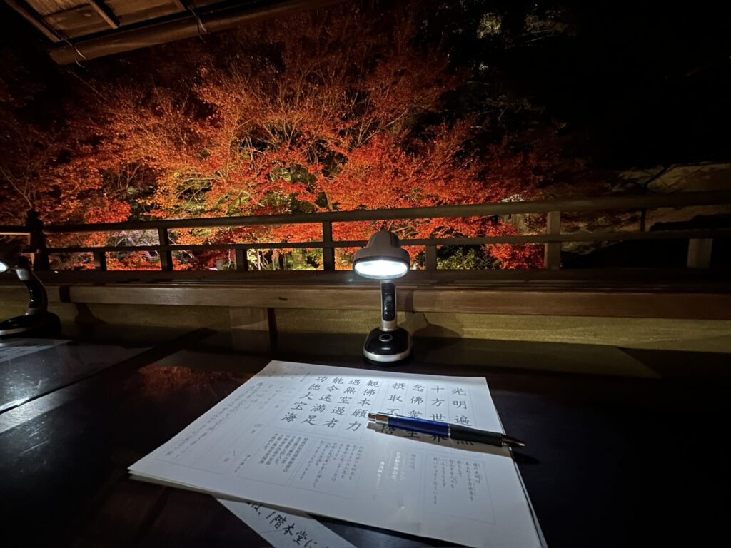 ライトアップされた美しい紅葉を眺めながら、写経ができるなんて、滅多にできない体験なので、嬉しかったです!