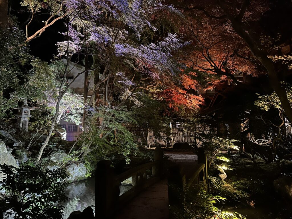 ライトアップされたお庭が廊下にリフレクションして、美しい幻想的な景観を醸し出していました。