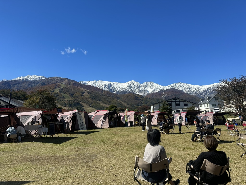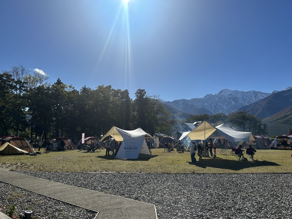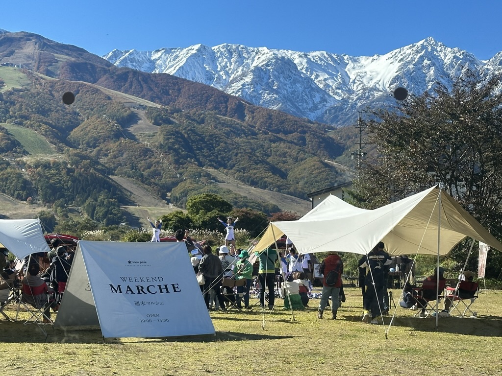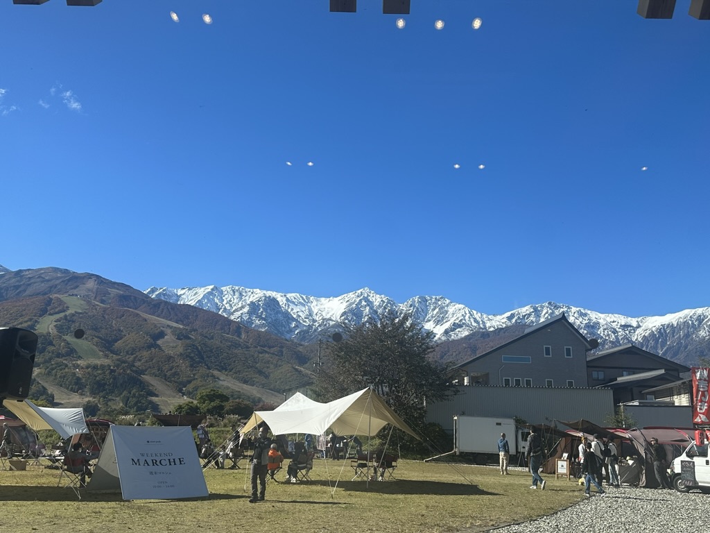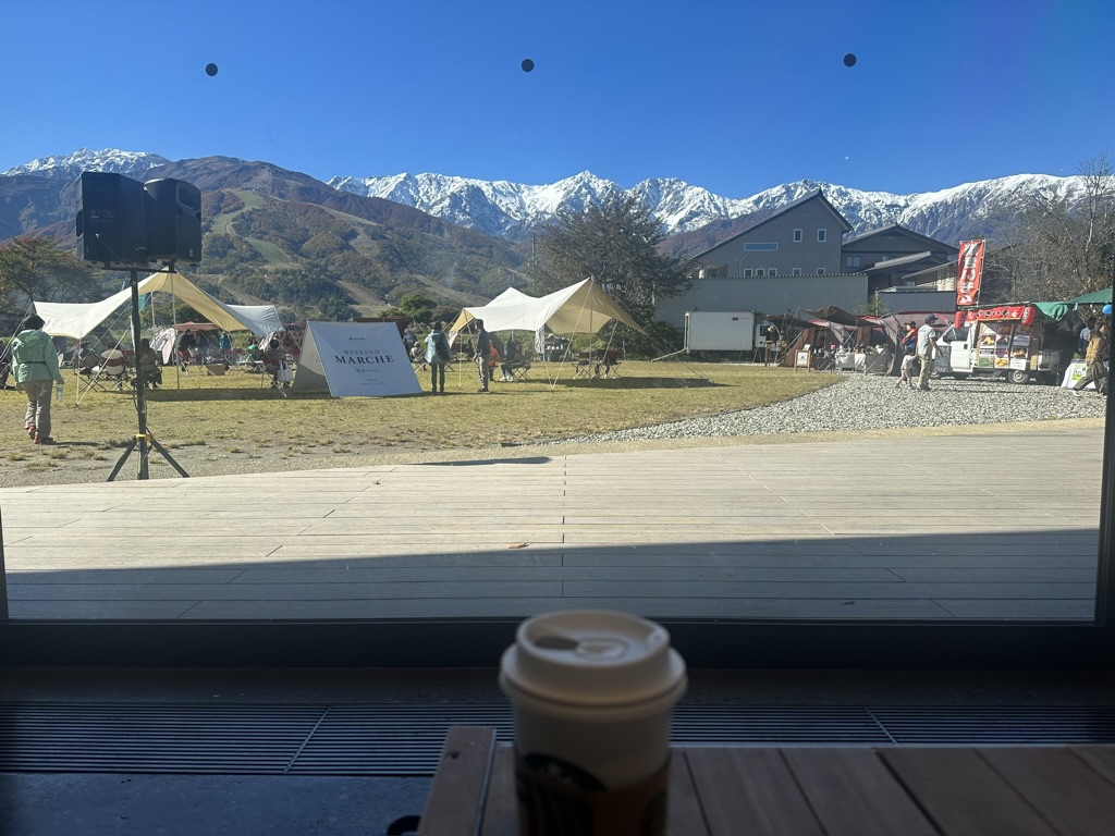 中央にはアウトドア用の椅子が置いてあって、雄大な北アルプスを眺めながら、マルシェで買ったものを食べたり、思い思いに過ごしている人達がいて、とってもピースフルな雰囲気でした✨