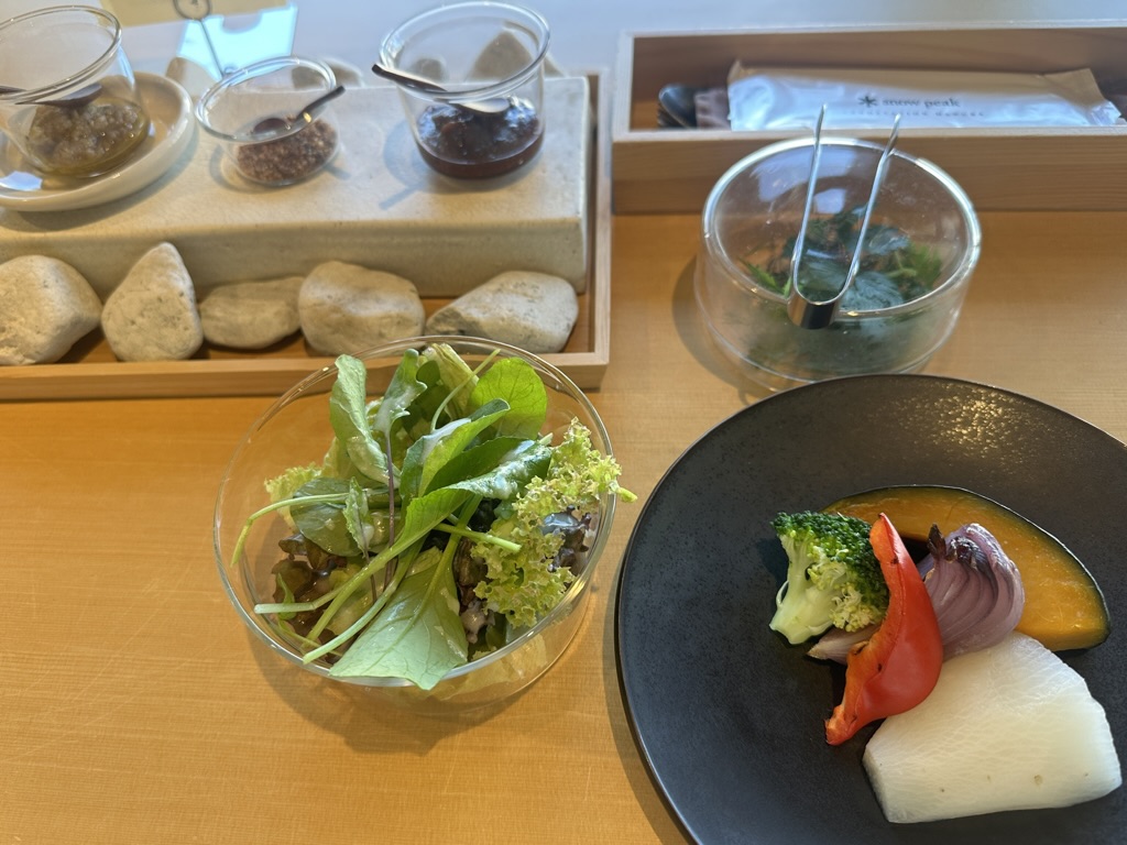 ほくほくの美味しい温野菜に新鮮なサラダをこれまた美味しいドレッシング達でいただきます。