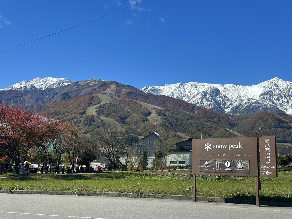 白馬駅から、10分程歩くと、北アルプスの雄大な景観と共に「Snow Peak LAND STATION HAKUBA」が現れます!