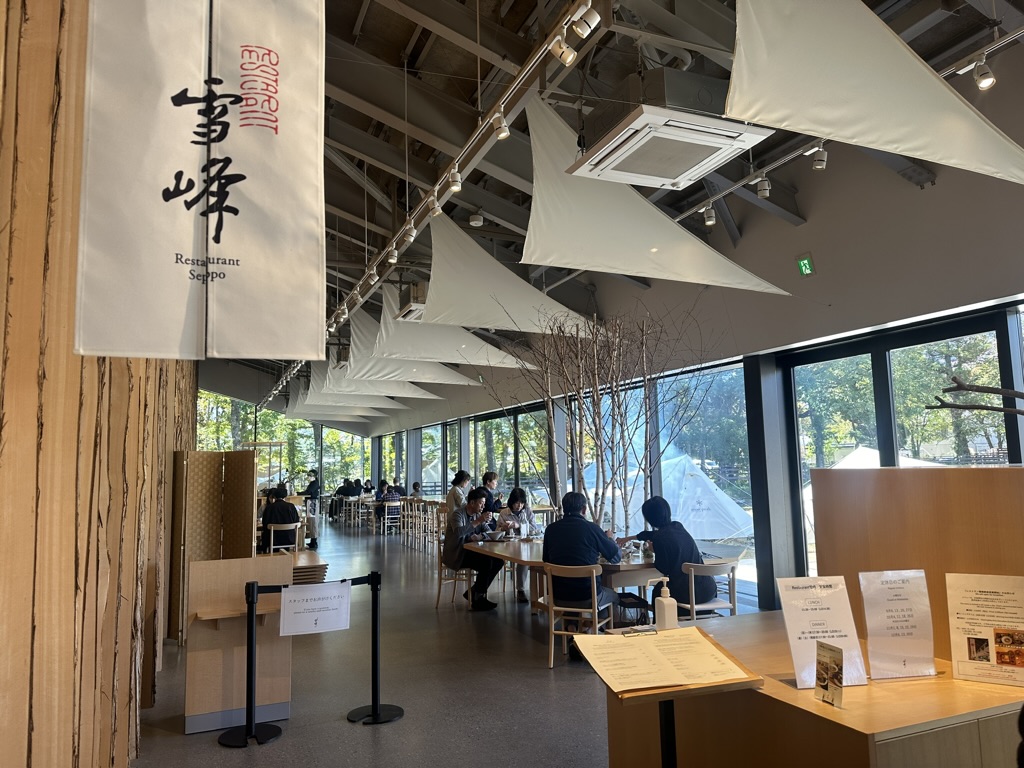 ・Snow Peak LAND STATION HAKUBAは、隈研吾デザインの複合施設で、天井部分の木組みは「雪の結晶」をイメージしているそうです!