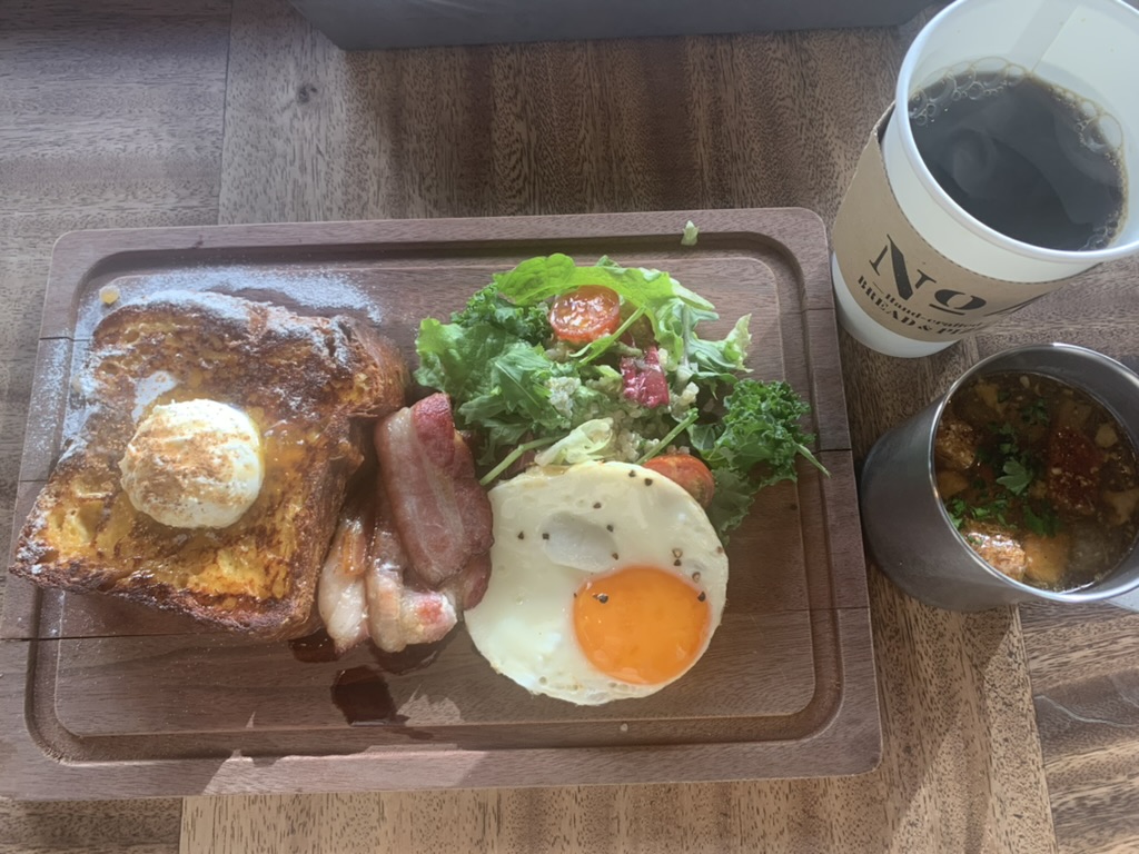 「フレンチトーストコンボ」は、ベーコン、卵、サラダもついて、ボリュームもあり、お腹いっぱいになりました🤗