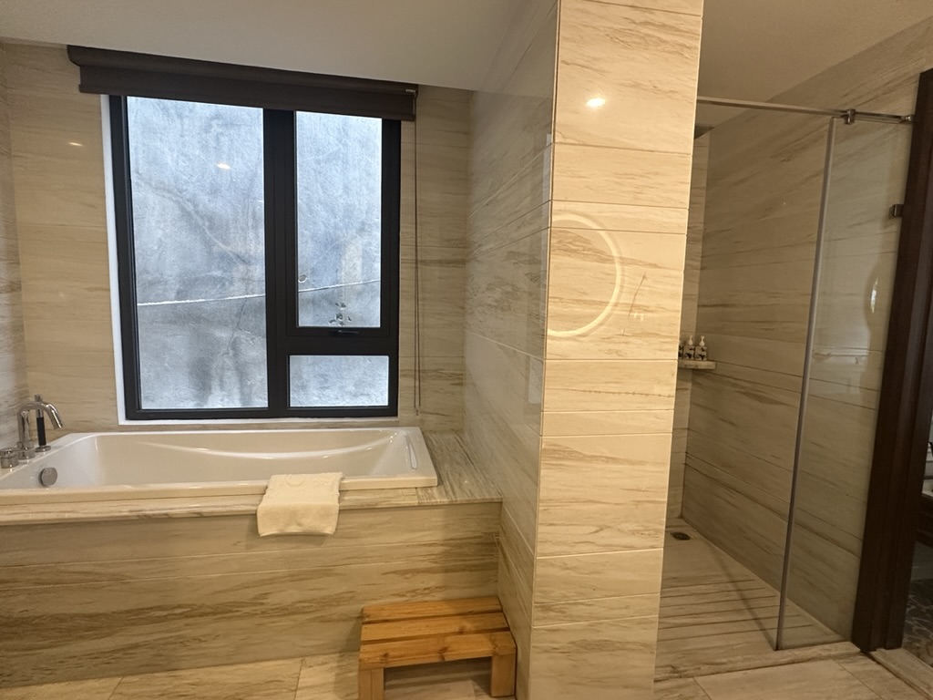 シャワーブースとバスタブが分かれているタイプで、ゆったり湯船に入れましたが、低層階だったので、窓からの眺めは残念。。