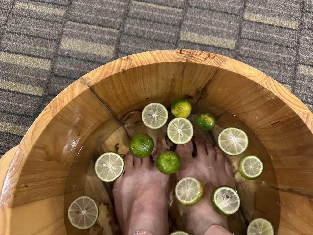 施術前には、ライムがたっぷり入ったお湯に足を浸かります。