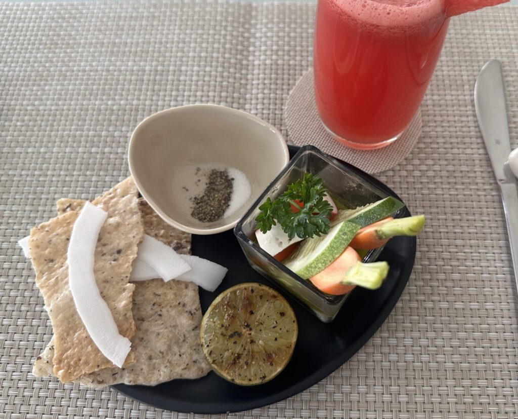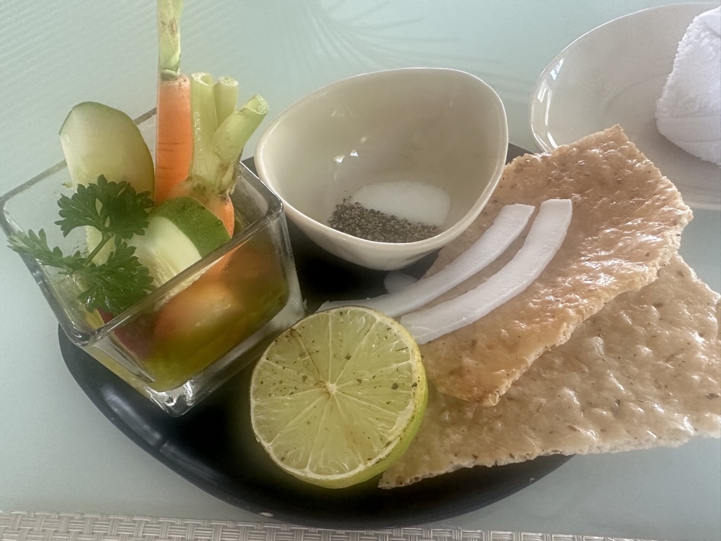 お通し?のようなもので、オリーブとバジルにつけた野菜たちとライム・塩・ブラックペッパーで食べるカリカリのライスチップス、これがとっても美味しい
