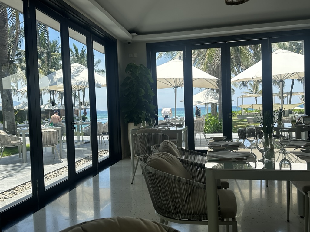 ガラス張りの店内からは、プールと海が見えて、リゾート感満載です。