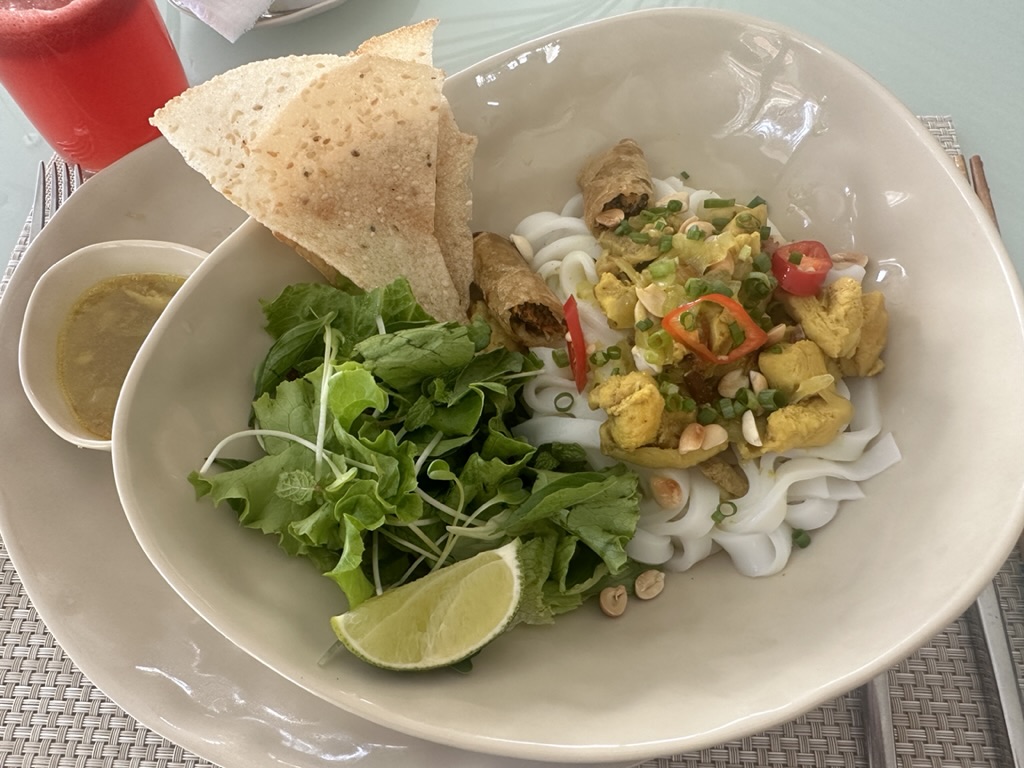 平たいライスヌードル、5種類のスパイスを効かせたチキン、地元のハーブ、野菜の揚げ春巻き、トマトグレイビー、ライスクラッカー、ライム