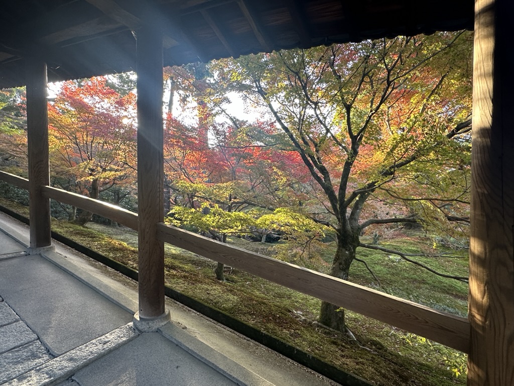 枯山水が美しい「北庭」は、東に仙人の住む島に見立てた巨石を配していて、遠くの紅葉が挿絵のように美しい。