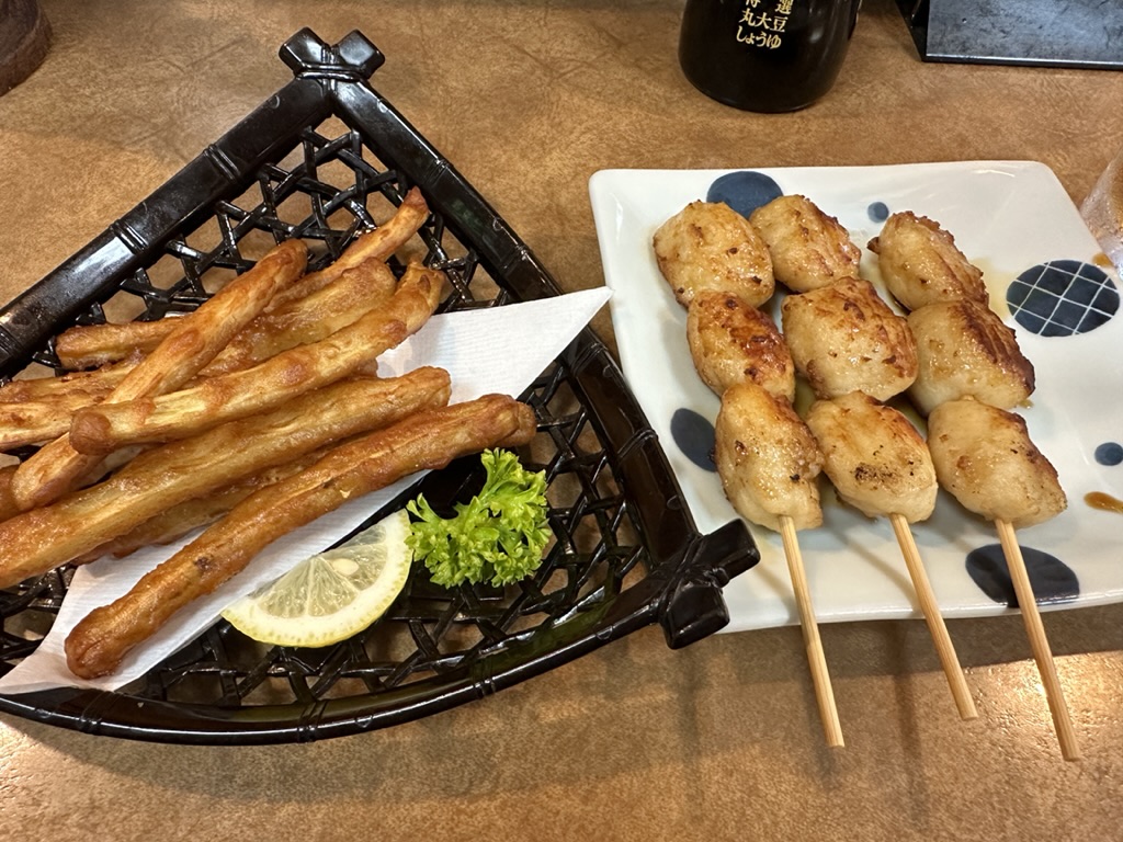 「ごぼうの唐揚げ」は甘味もあって、ポリポリいけます。つくねも3本もついていて、柔らかくて美味しい。